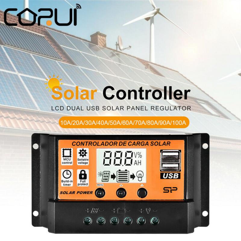 Corui Solar Charge Controller: A smart home device with an LCD screen that regulates solar panels, features dual USB ports, and includes MPPT/PWM technology for efficient charging. It also has light control delay and control functions, making it suitable for various solar power applications, including battery charging.