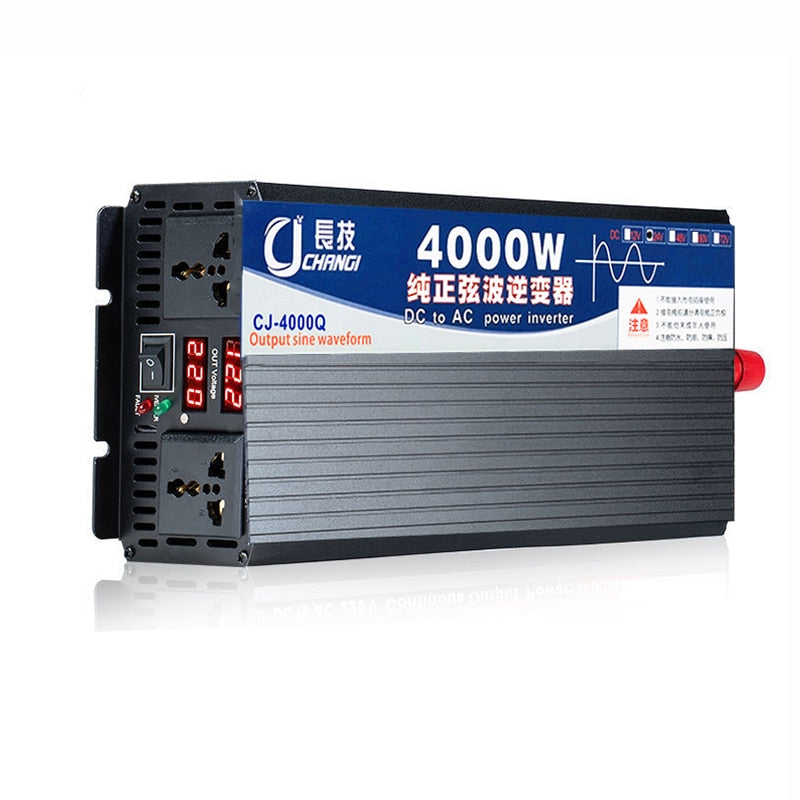 Universal DC to AC inverter with pure sine wave output, supports voltages from 12V to 48V, and power ratings up to 5000W. Features a double display LED indicator, on/off switch, and universal socket.