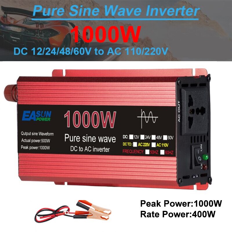 Inverter converts 12V/24V DC power to pure sine wave AC (220V) with three output levels: 1000W, 1600W, and 2200W. It also supports 48V DC input. The inverter frequency is adjustable from 50Hz to 60Hz.