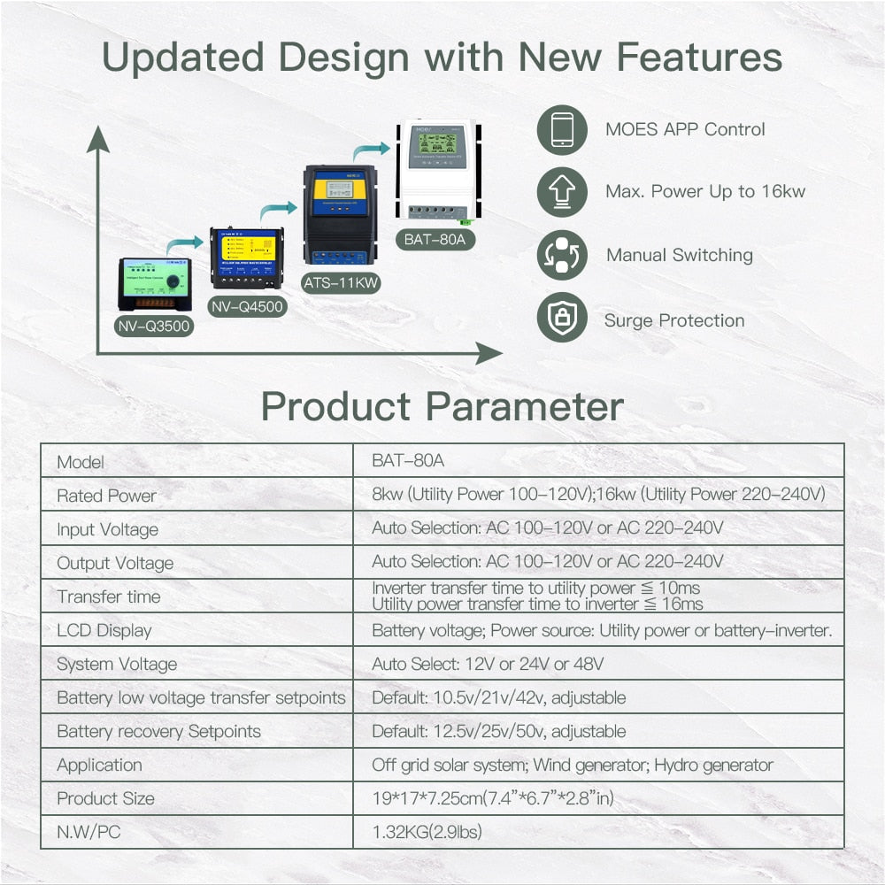 Automatic Transfer Switch for Off-Grid Solar/Wind System: Seamlessly switches between grid power and inverter power (DC 12/24/48V to AC 110/220V) with Moes' patented technology, ensuring reliable and efficient energy supply.
