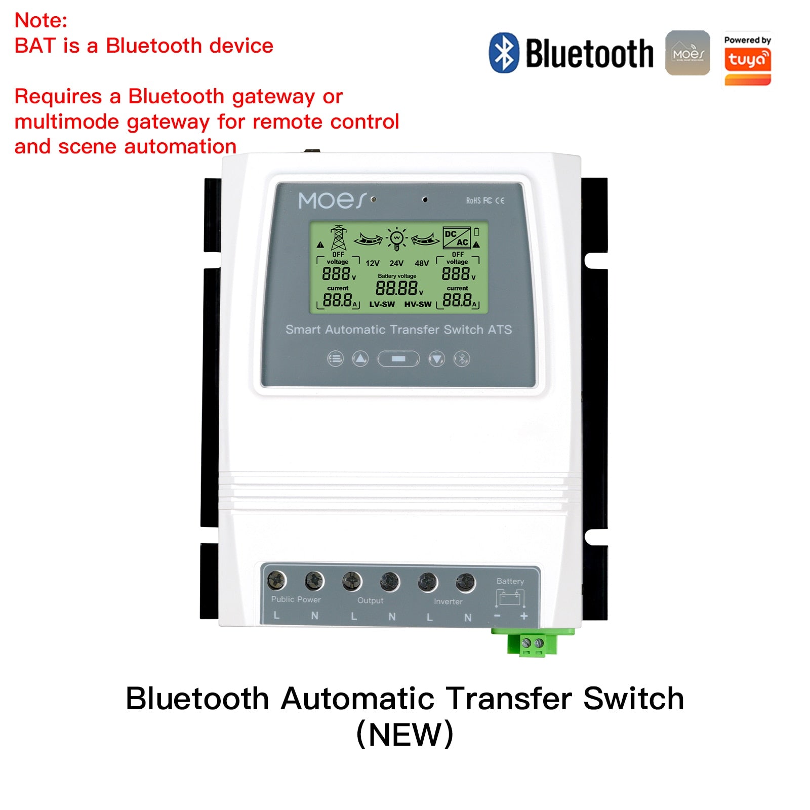 MOES Tuya Smart Dual Power Controller: An automatic transfer switch for off-grid solar wind systems. It features automatic mode switching, grid status monitoring, and inverter state control. Supports DC voltage ranges of 12V, 24V, and 48V, as well as AC voltage ranges of 110V and 220V. This device ensures a stable power supply, with battery charging and discharging management capabilities.