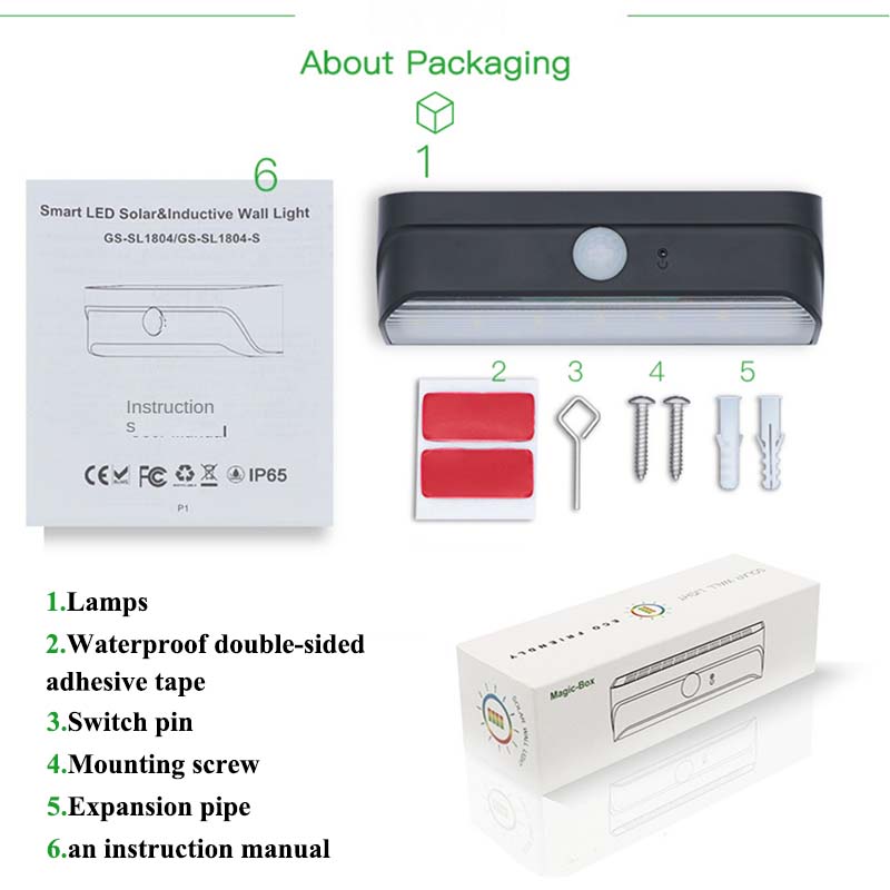 Charge in the sun during the day, and it will light up automatically when it gets dark. Someone in the sensing range will light up for 15 seconds after passing the strong light, and the light will remain light after the person leaves.