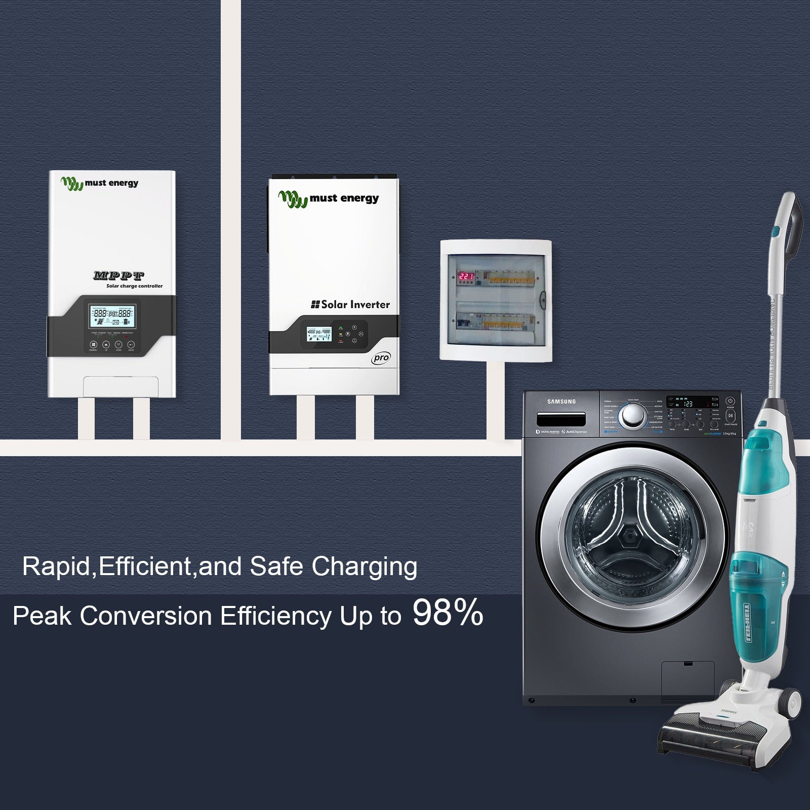 Must Energy's MPPT solar charge controller offers rapid, efficient, and safe charging with up to 98% peak conversion efficiency. Compatible with 12V, 24V, 36V, or 48V systems.