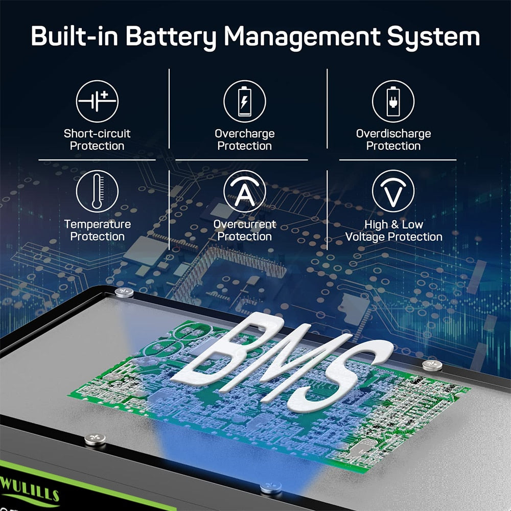 Extraordinary battery performance guaranteed by high-quality LiFePO4 cells and advanced BMS (built-in battery management system). Features include: 100% SOC and DOD protection, up to 6,000 cycles at 80% DOD, 15,000 cycles at 60% DOD for over-current protection, short-circuit protection, and high-temperature cut-off. Compliant with FCC, CE, UL, and PSE standards.