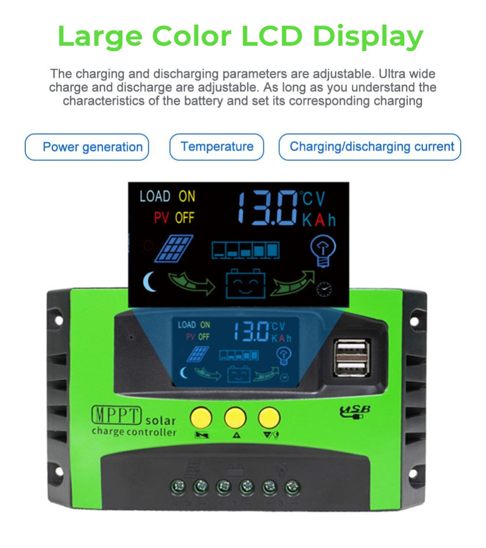 This MPPT solar charge controller features multiple built-in protections, including overheating, overcurrent, open-circuit, reverse-connection, short-circuit, and charging protection. It self-re recovers from faults without damaging the device.