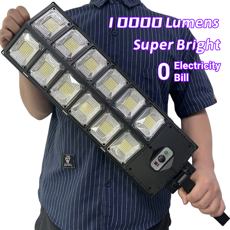Outdoor Solar Lamp with Motion Sensor: 10,000 Lumens. This lamp features high-power solar charging, automatic nighttime activation, and long-range lighting. It's waterproof, durable, and easy to install with remote control or human body induction. No charging required.
