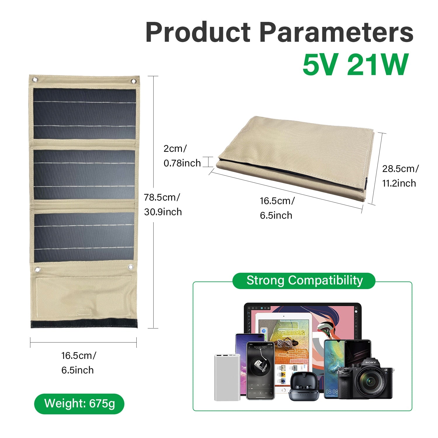 Suitable for outdoor enthusiasts, this solar panel powers devices like cameras, fans, and power banks for hiking, camping, and other adventures.