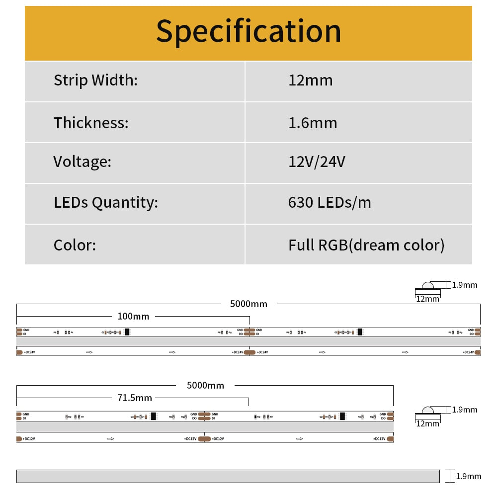 Flexible LED strip with 630 LEDs per meter, addressable and RGB color, suitable for room decor. Operating voltage: DC 12V or 24V.
