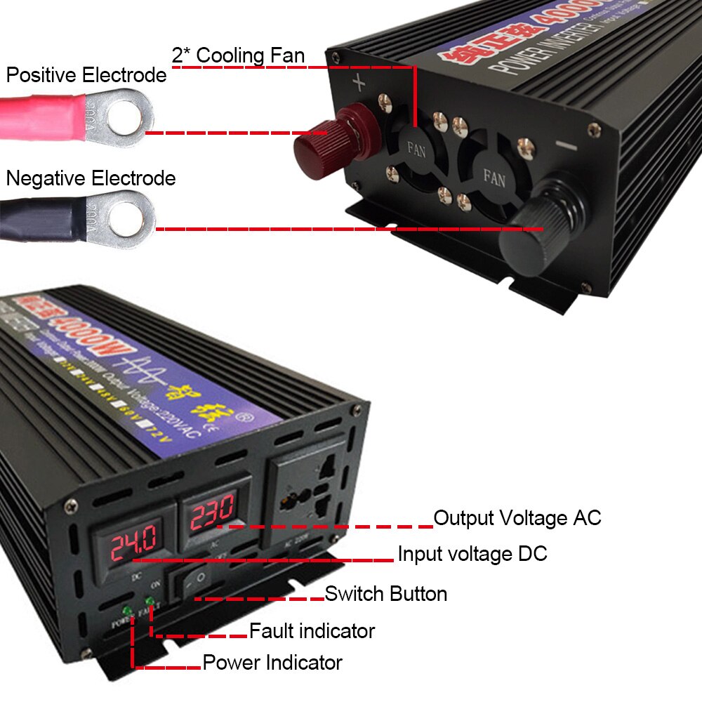 Power Inverter: Pure Sine Wave, 4000W (2000W-3000W), DC to AC converter. Converts 12V/24V/48V DC power to 110V/240V AC power. Ideal for car power supply applications.