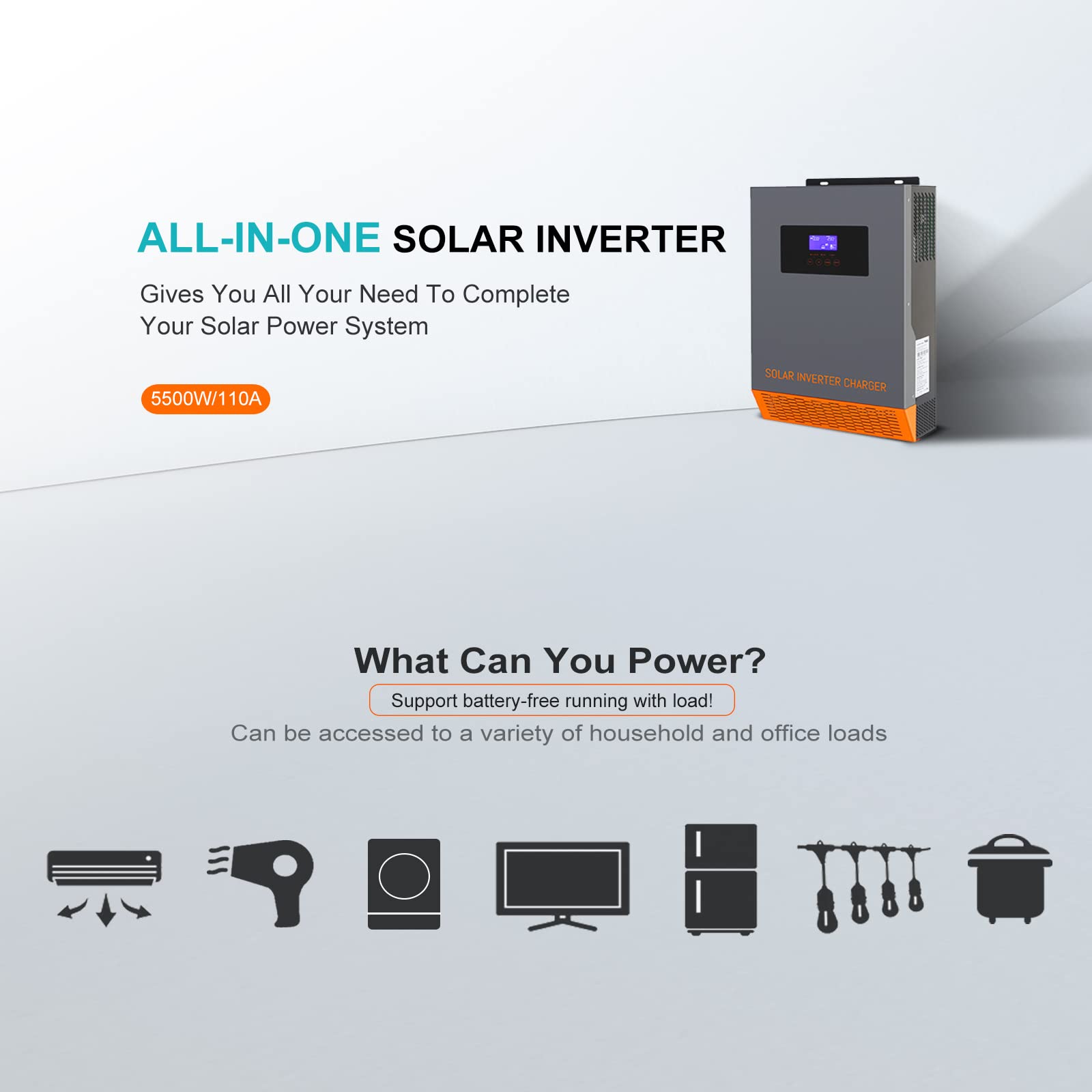 Introducing PowMr's all-in-one hybrid solar inverter, perfect for complete solar power systems. This MPPT inverter supports battery-free operation and can power various household and office loads. With its built-in 110A charger, you can efficiently charge your batteries.