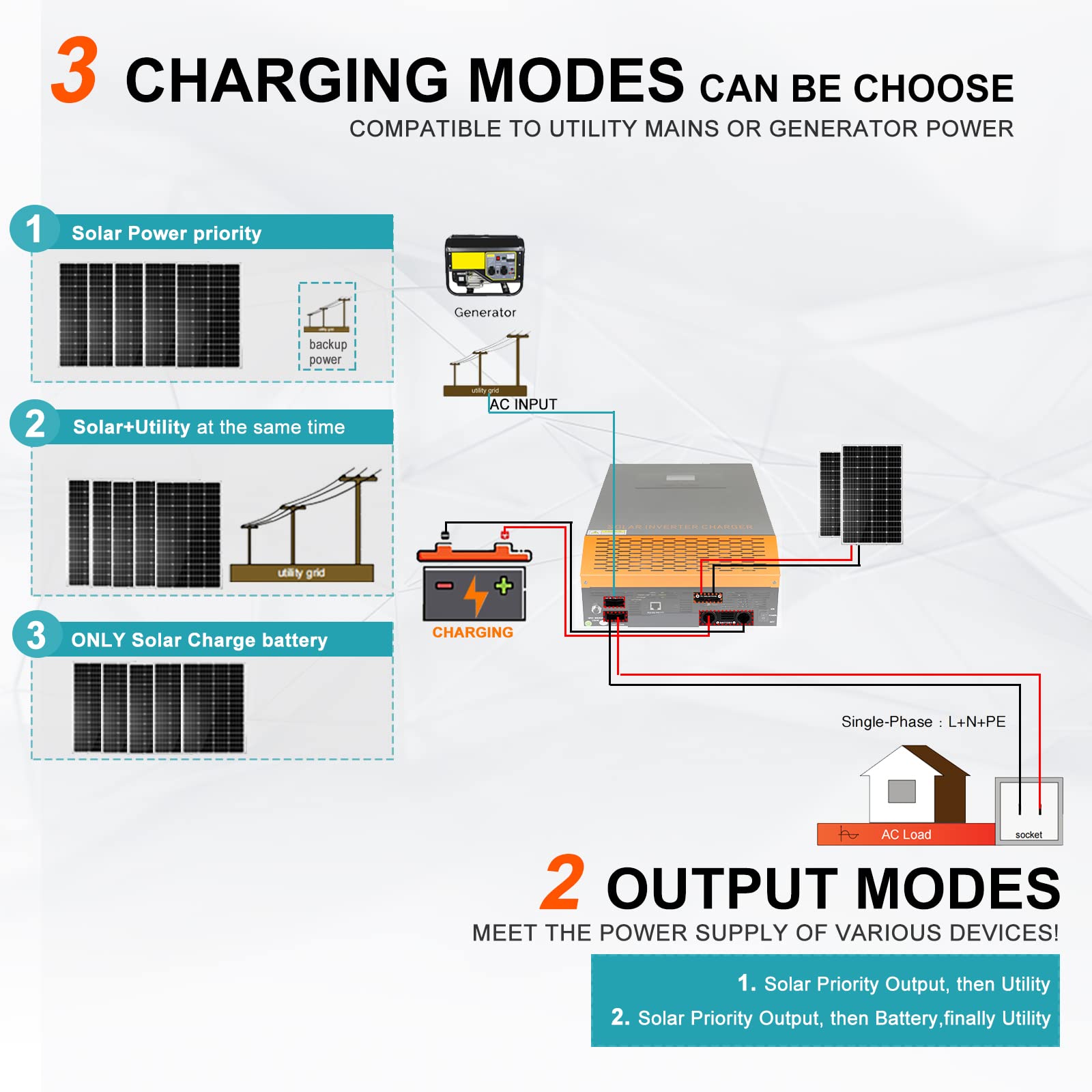 Choose from three charging modes: single-phase solar power charging with priority output to AC load or socket backup, or charge battery simultaneously with utility power. Two output modes are available: prioritize solar power and then utility, or prioritize solar power and then battery, finally using utility as needed. Supports AC input and grid charging.