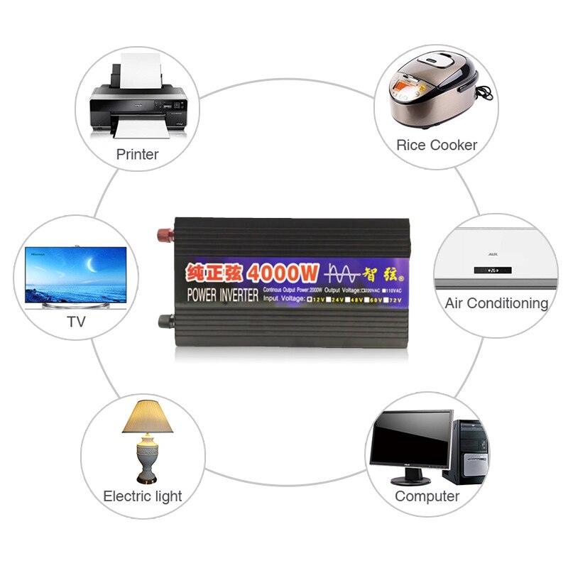 Pure Sine Wave Inverter, 2000W, 3000W, or 4000W, converts DC power from 12V or 24V to AC power at 220V. This inverter features pure sine wave output, suitable for home or car use.