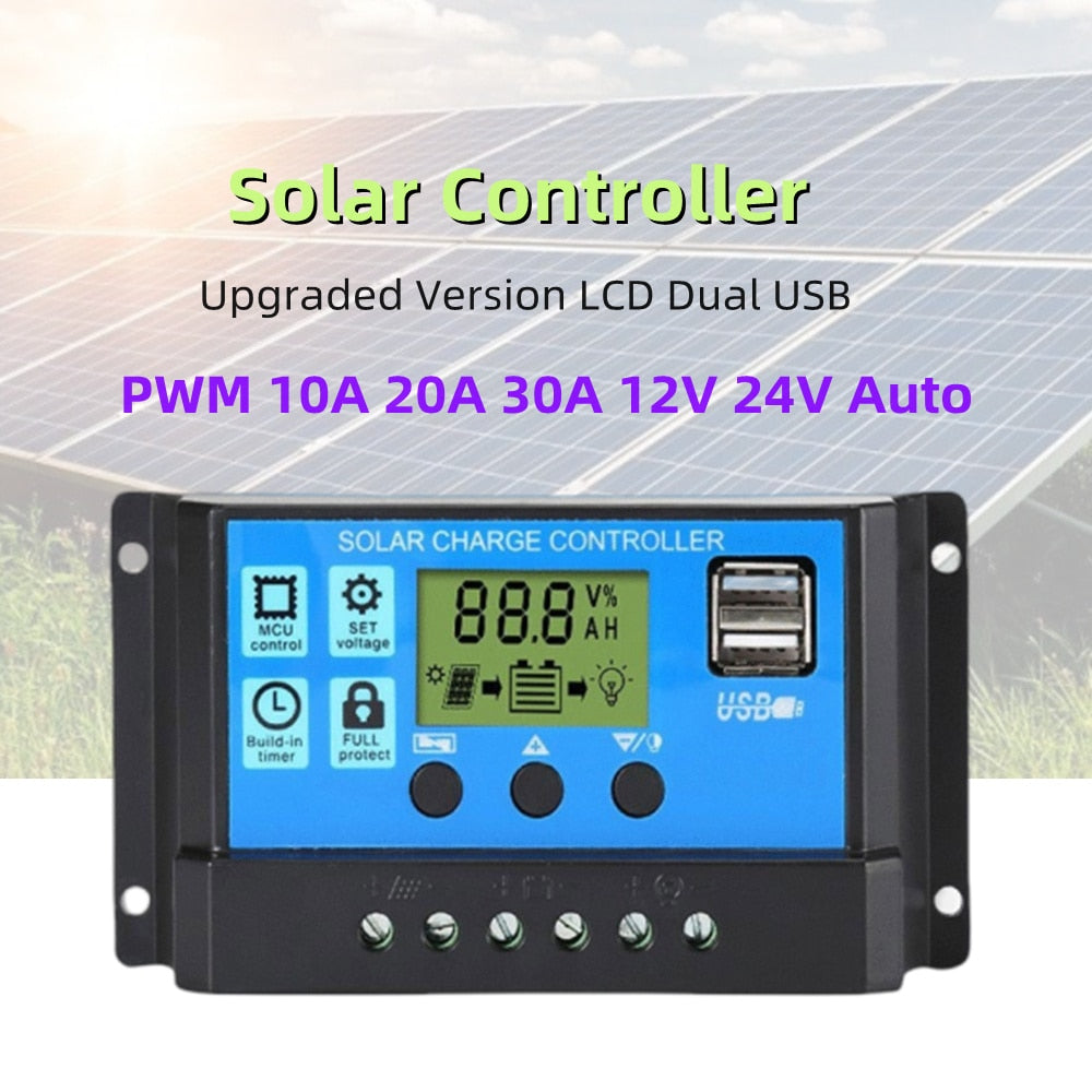 Upgraded smart solar charge controller for 10A, 20A, or 30A with 12V or 24V input. Features auto PWM, LCD display, dual USB outputs (5V), and build-in overcharge protection.